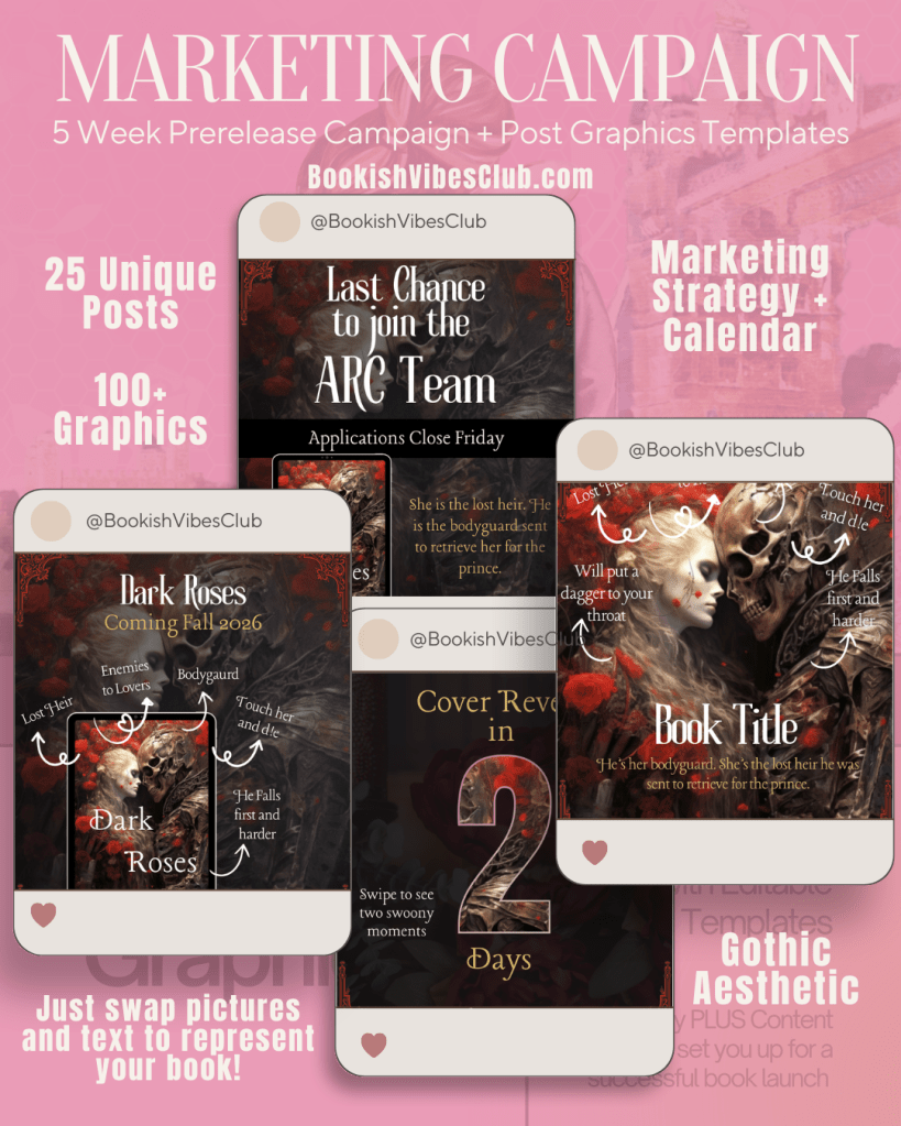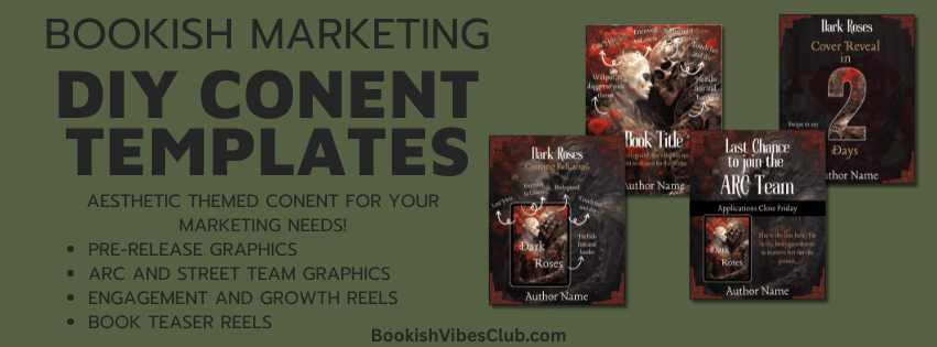 Pick an aesthetic and add pictures of your book or book scenes! B-roll footage and graphics are included, so you can just change the text and post! PLUS, you get the marketing strategy to go with it. You will know how to post, when to post, and where to post each piece of content to get the best engagement and growth.