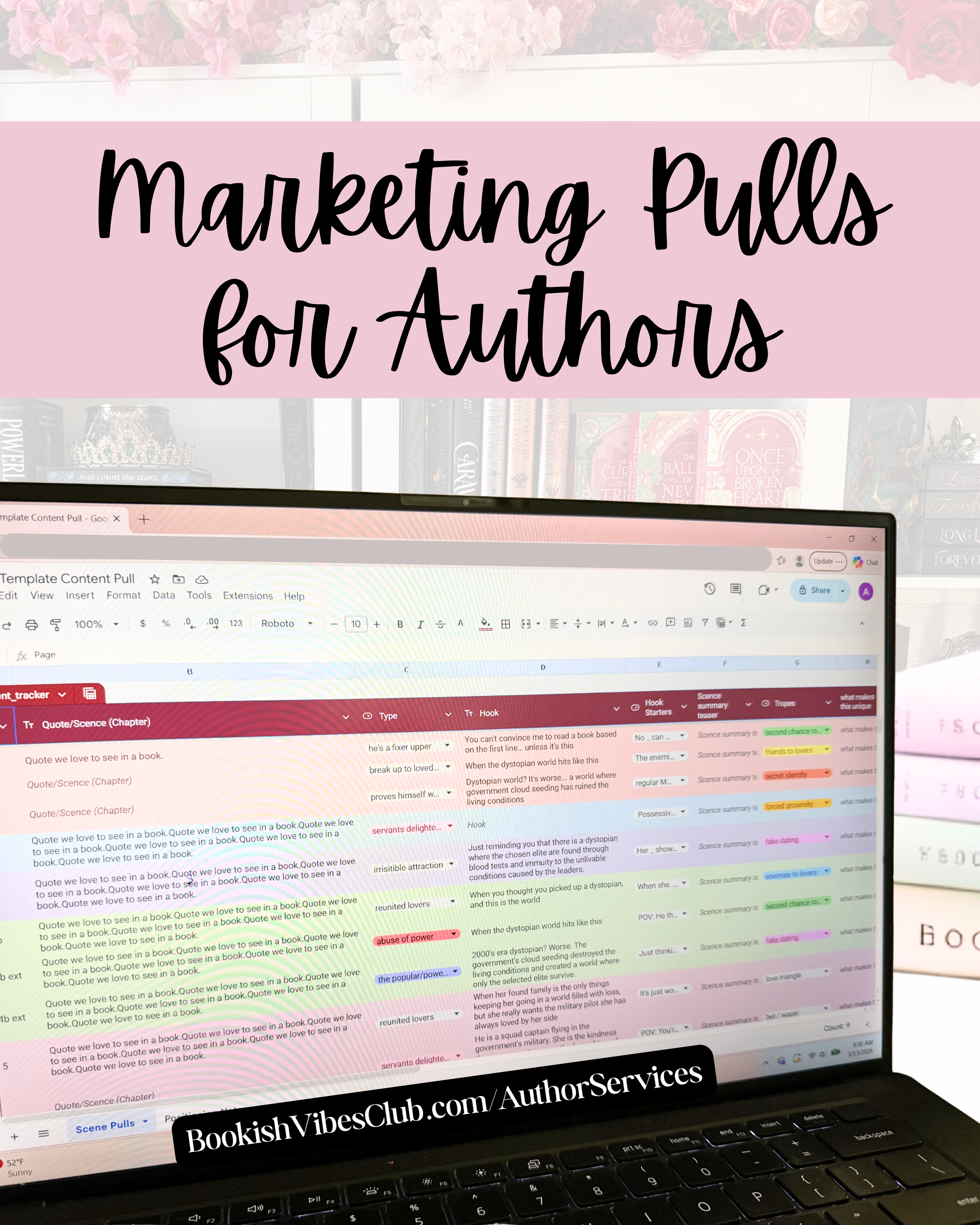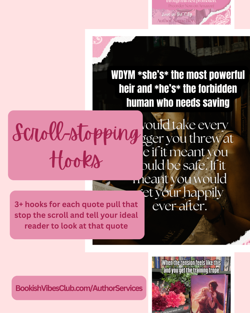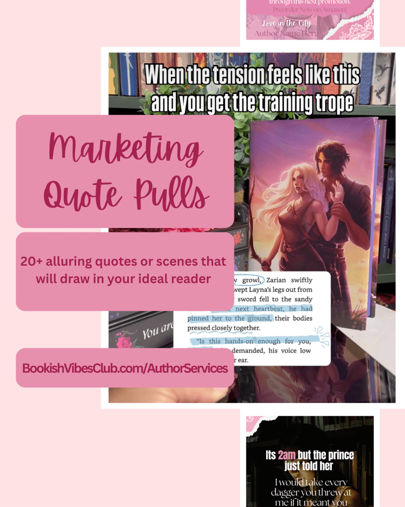 As both an emotional reader and a marketing strategist, I am drawn to the compelling scenes and quotes that readers cannot turn away from. You will get a variety of alluring hooks for each quote/scene pull that is designed to attract readers into the feels of the scene while also using bookish marketing psychology to develop a strategic and unique positioning for your book.